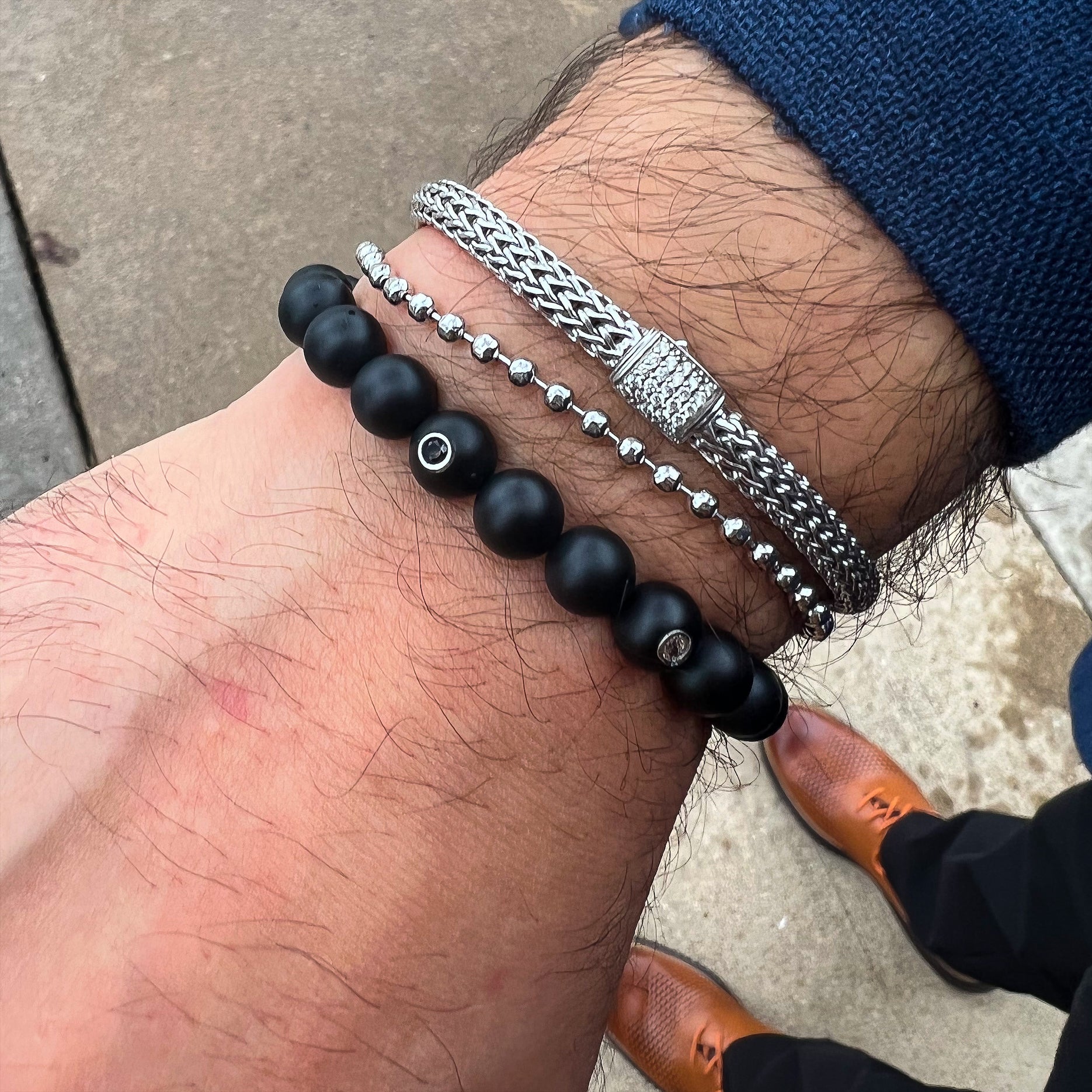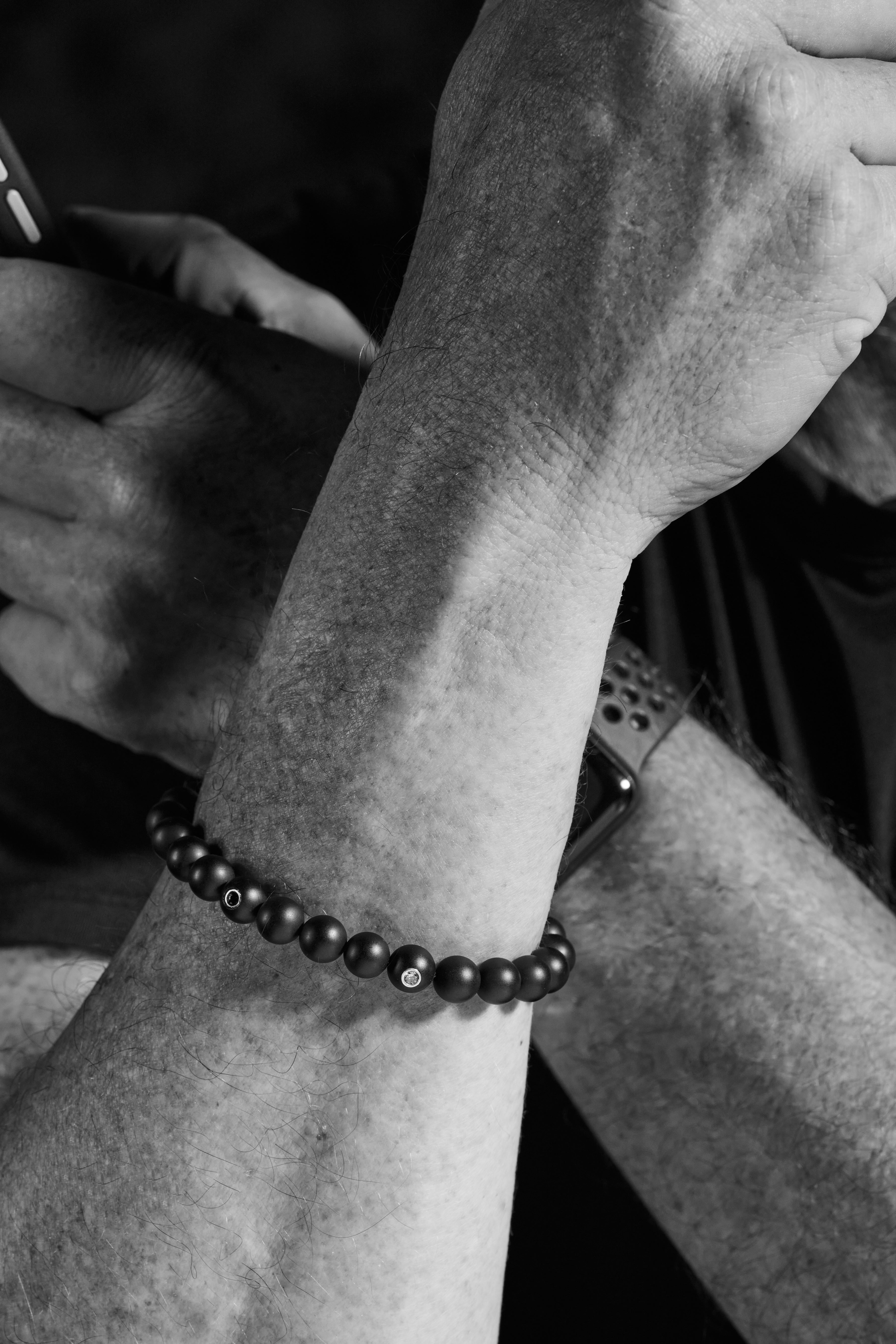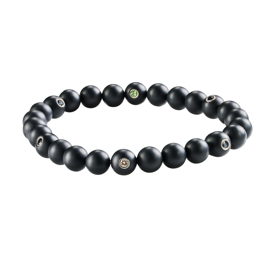 Sleek Unisex black matte onyx beaded bracelet, featuring four black diamonds, a green tsavorite, and a champagne diamond